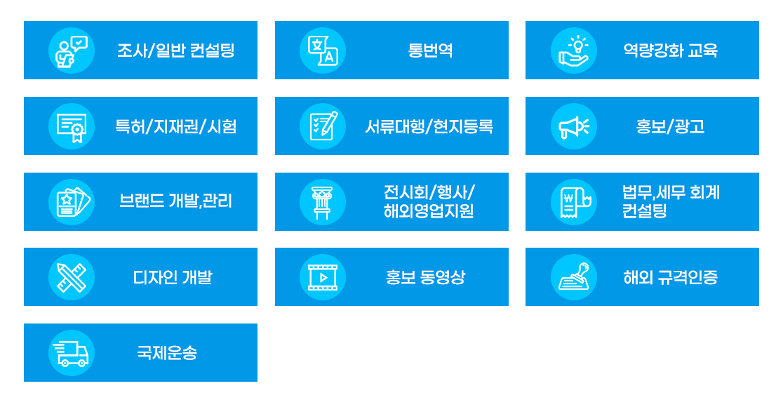- 내수, 수출 중소기업에 규모별, 역량별 맞춤형 해외마케팅 서비스 지원을 통해 수출액 확대 및 수출선도기업 육성