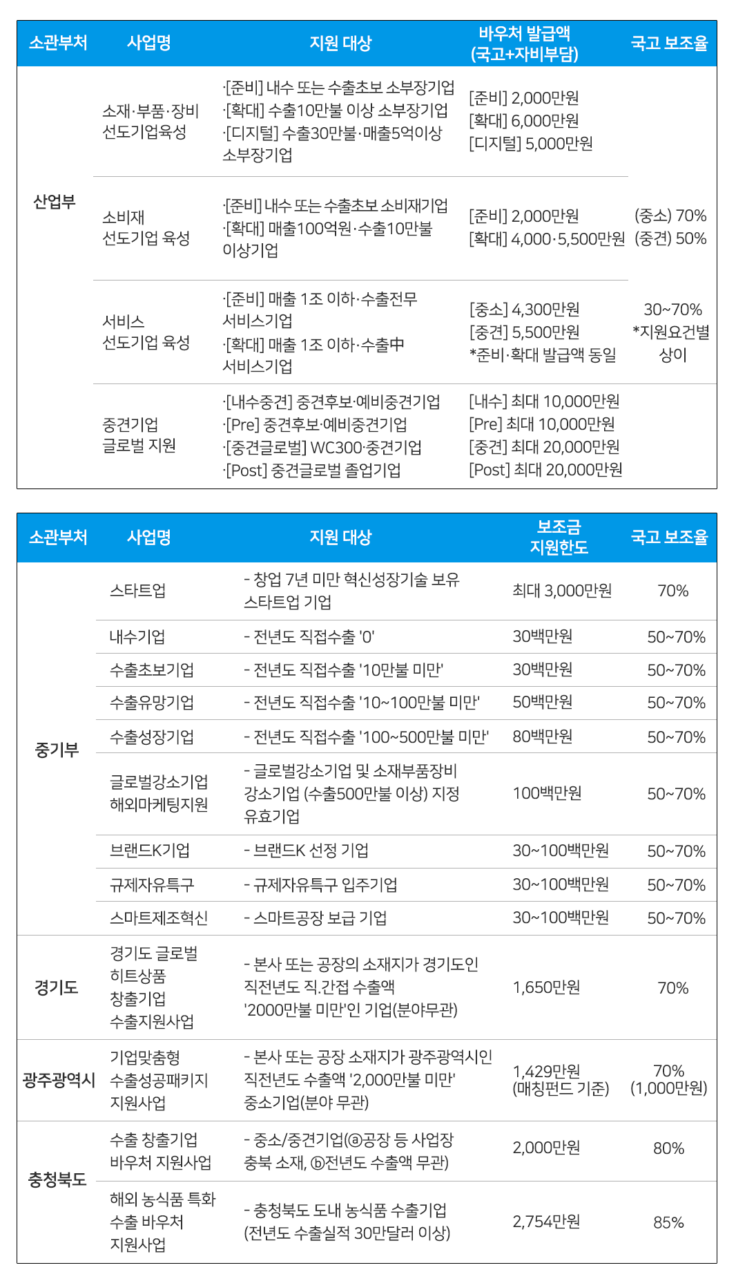 아래 각 사업별로 선정된 기업을 대상으로 바우처를 발급하며 선정기준, 국고보조율 등은 사업별로 상이합니다.